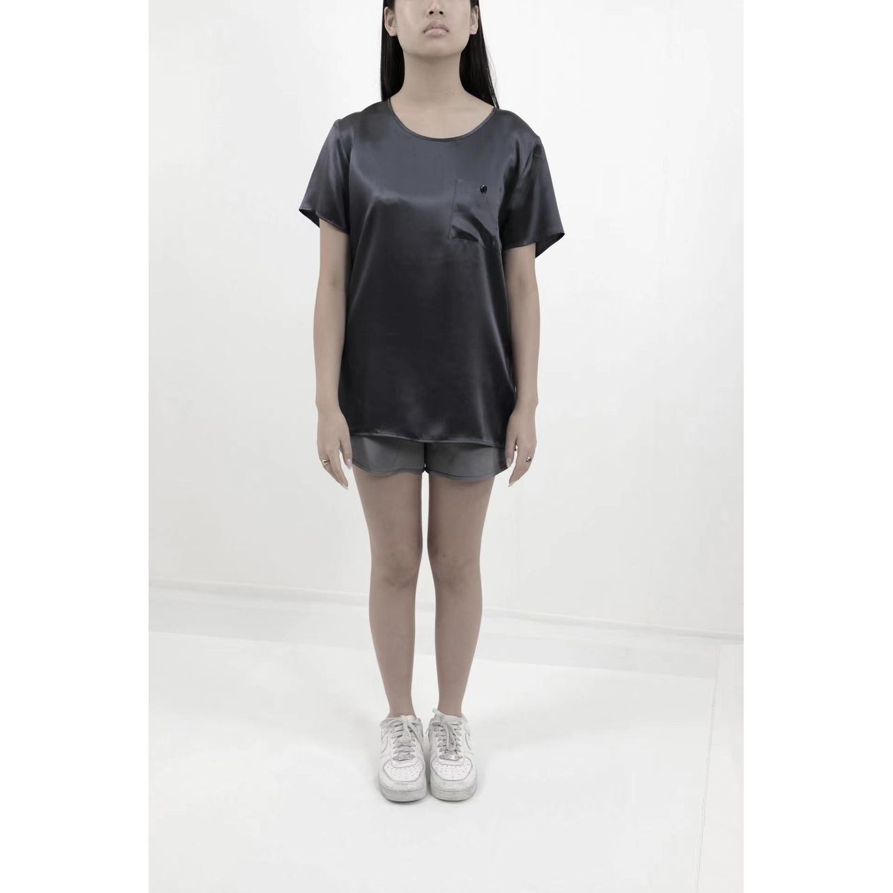 真絲短袖上衣,左上胸有小袋,後中上端有拉鍊,方便穿着,簡單易配襯,柔軟舒適,上班或休閑穿着也宜