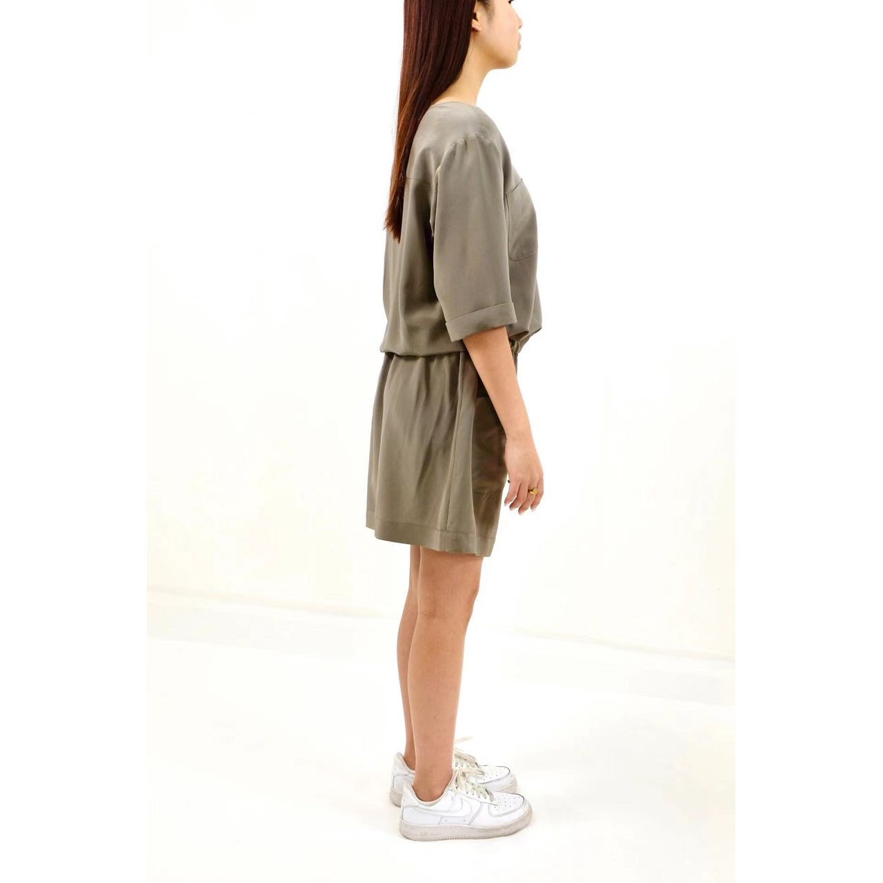 女裝真絲短袖連身裙,四個袋,半開胸,腰束繩,舒適,休閒。Free size