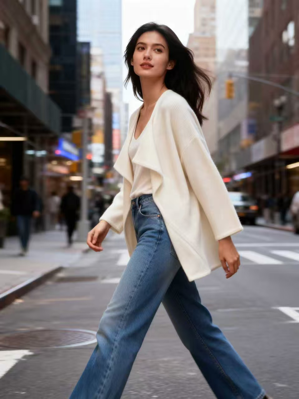 This elegant cream-colored cardigan features a loose, flowing silhouette with a draped front design that adds a touch of sophistication to any outfit. Crafted from ultra-soft, lightweight yarn, it offers both comfort and versatility for year-round wear. The open-front style and relaxed fit create an effortlessly chic look, perfect for layering over dresses, tops, or tees. Long sleeves provide coverage while maintaining a graceful drape, and the neutral ivory hue complements any skin tone and pairs seamlessly with both casual and semi-formal ensembles. Whether strolling through city streets or enjoying a brunch date, this timeless piece combines comfort and elegance to elevate your wardrobe.