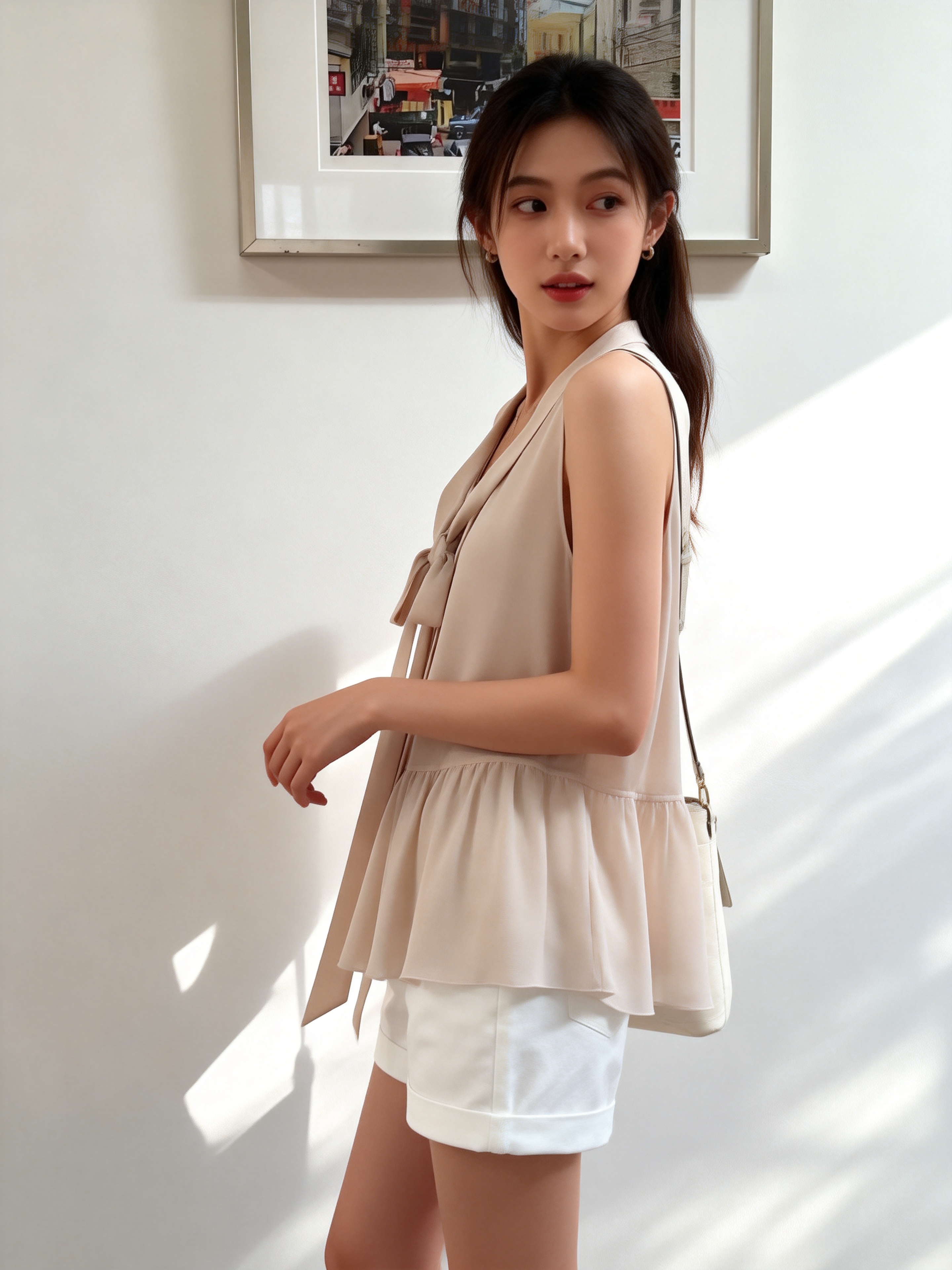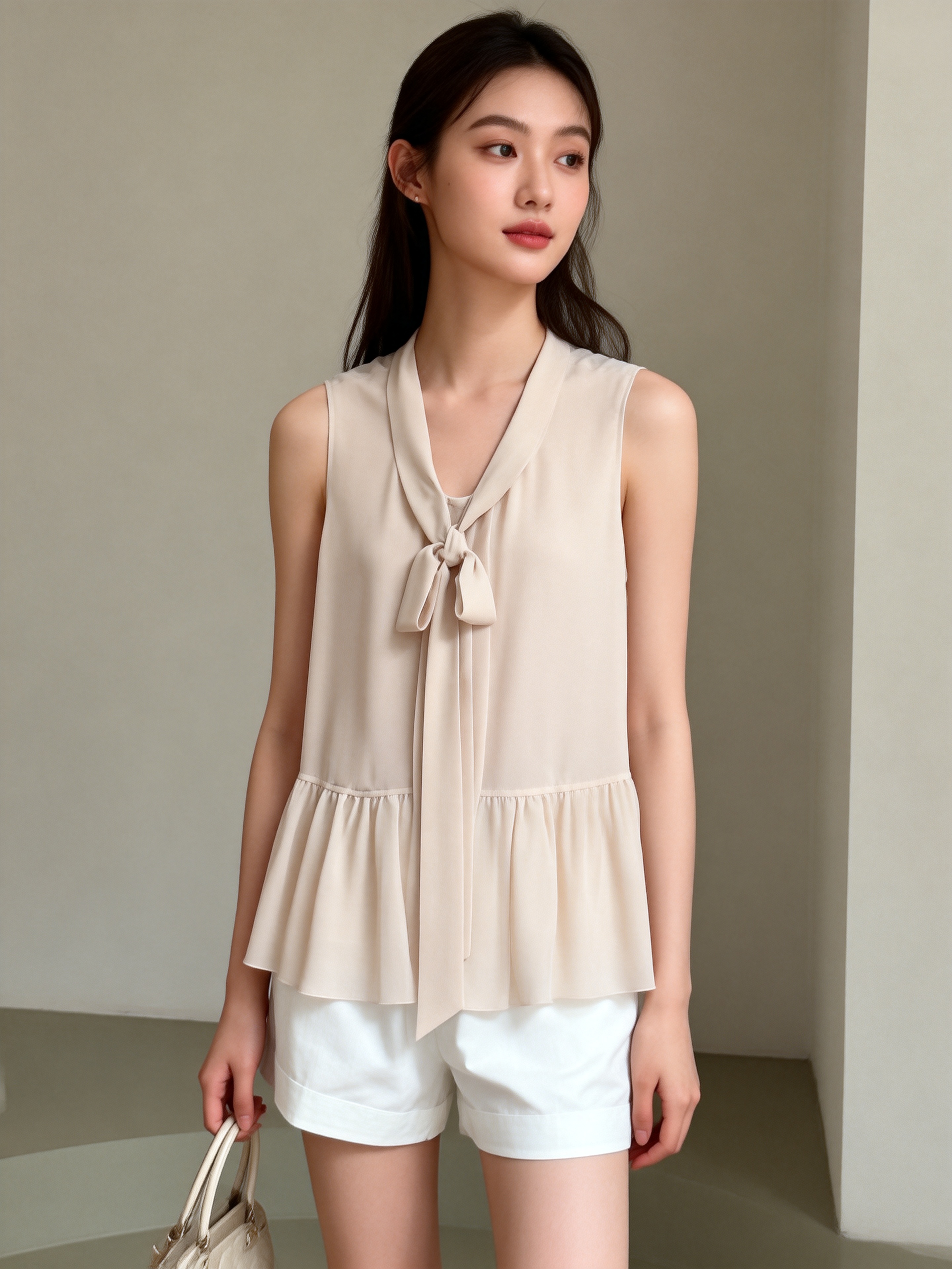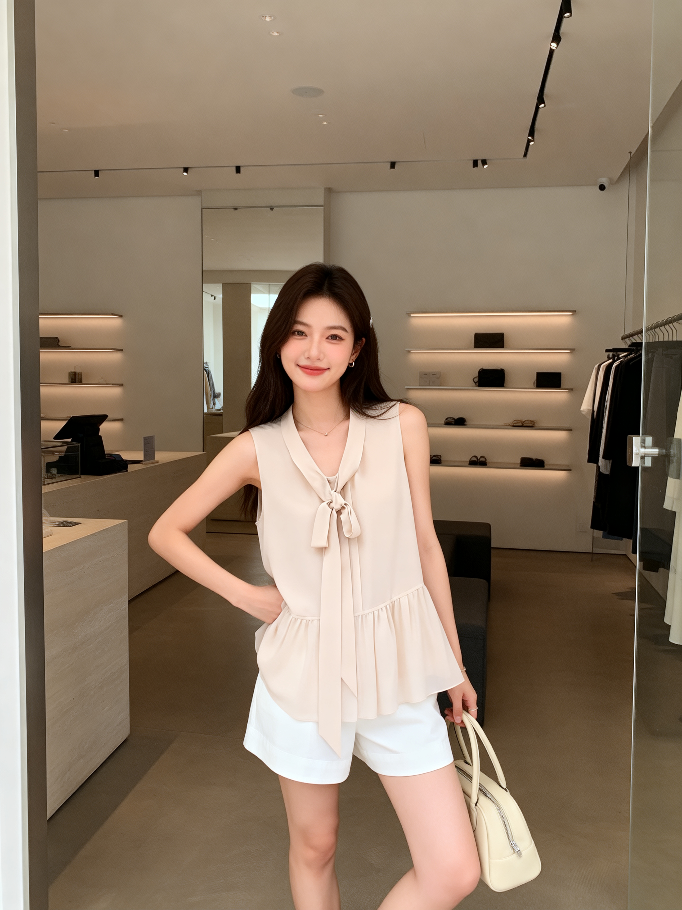 This is a sleeveless blouse with a V-neckline and a ribbon tie at the front. It features a ruffled hem design. The blouse has a loose fit.