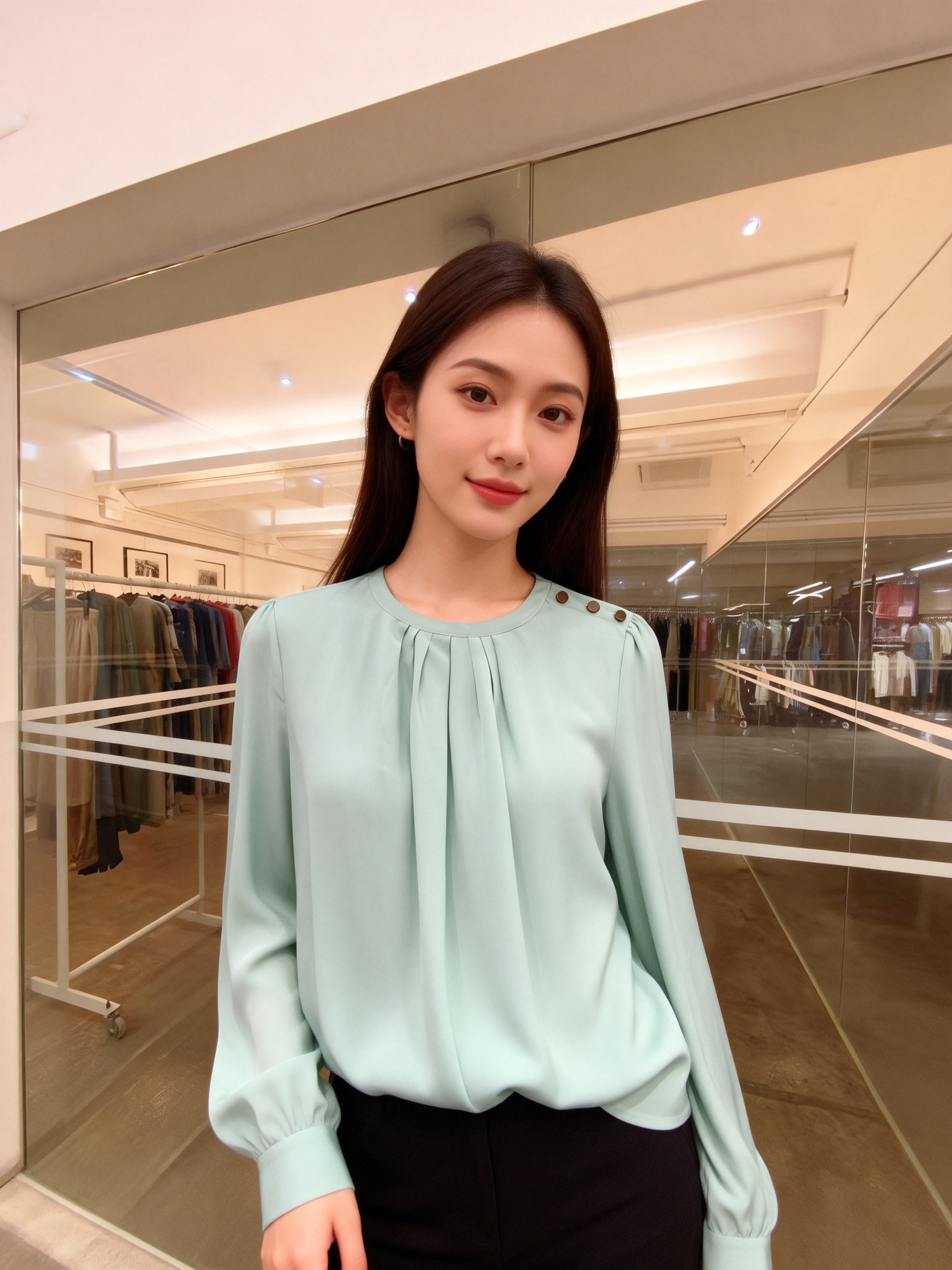 100% Silk round neck long sleeves blouse with pleat under the neck line 真絲圓領長袖恤衫襯衫