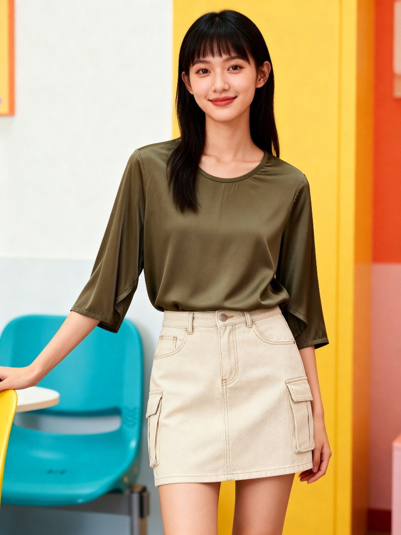 100% Silk satin round neck 3/4 sleeves blouse 真絲圓領中袖恤衫襯衫