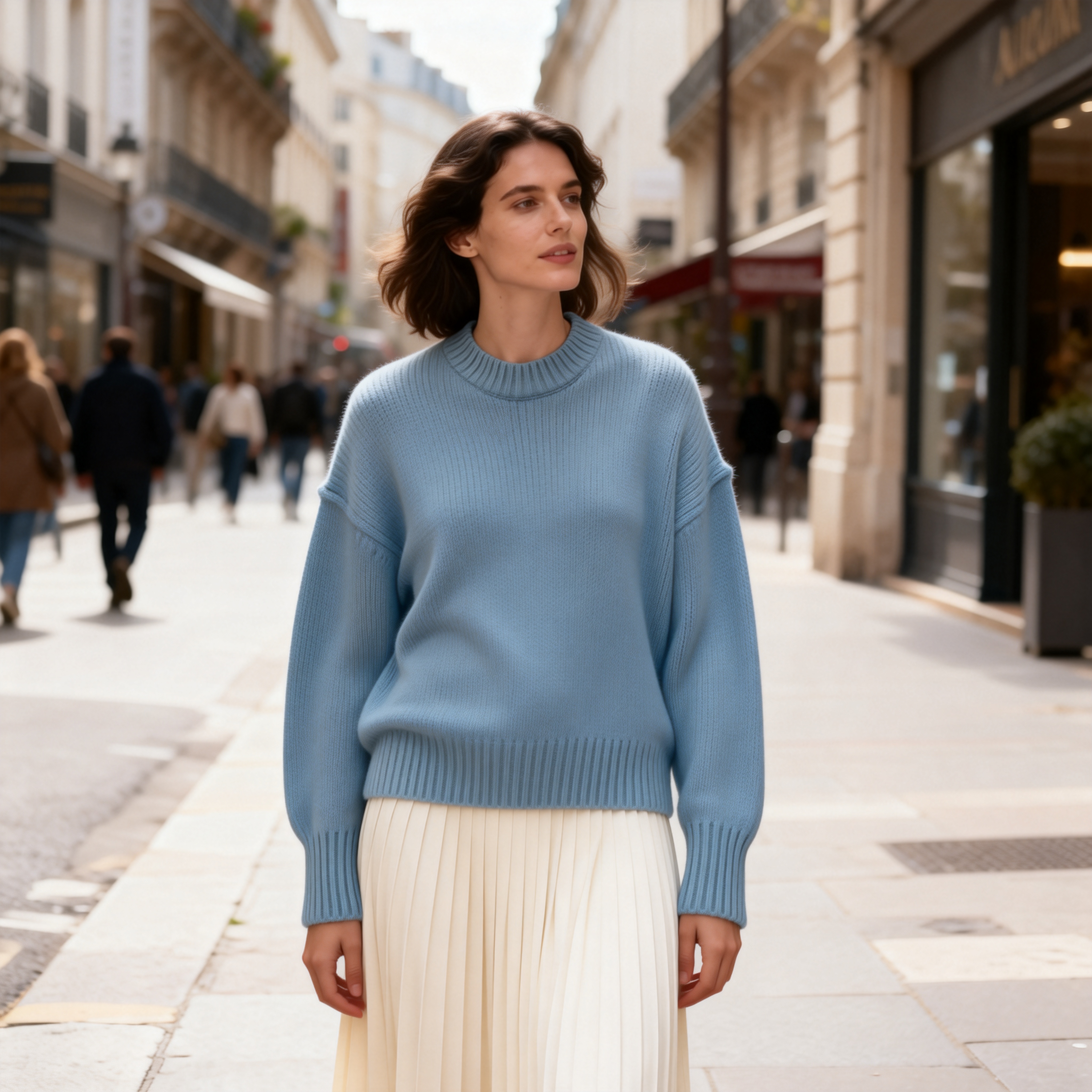 This middle blue crewneck sweater features a relaxed, oversized silhouette with ribbed detailing at the neckline, cuffs, and hem. Crafted from soft, high-quality wool cashmere yarn, it offers a cozy yet stylish look perfect for casual outings or layered ensembles. The versatile design pairs effortlessly with jeans, skirts, or tailored pants, making it a wardrobe essential for transitional seasons. 90% WOOL 10% CASHMERE