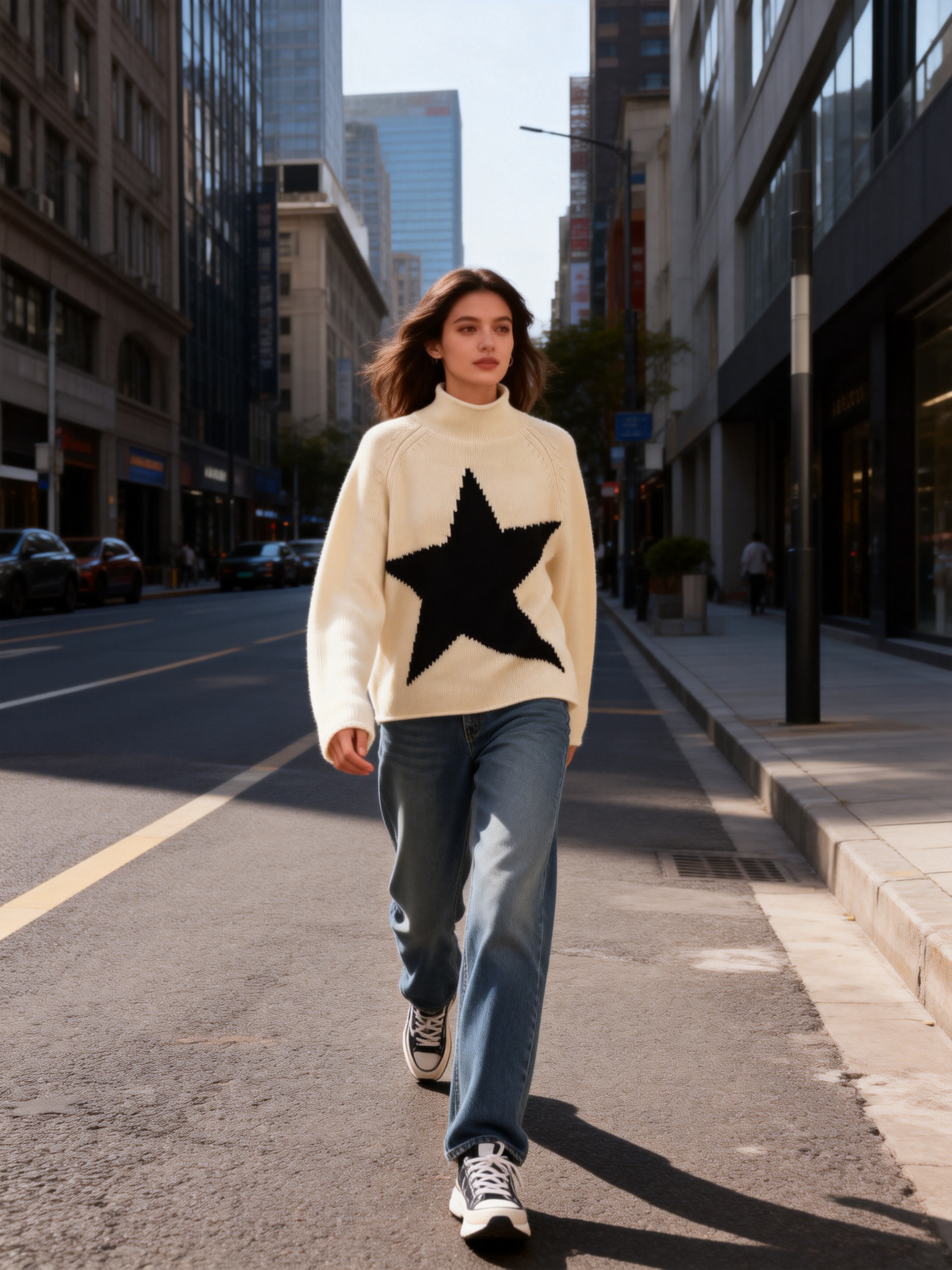 This cream-colored turtleneck sweater features a large black star motif prominently knitted on the front. The oversized silhouette has dropped shoulders and ribbed detailing at the collar, cuffs, and hem, creating a relaxed yet stylish look. The chunky knit texture adds warmth and dimension to the piece. 70% WOOL 30% CASHMERE