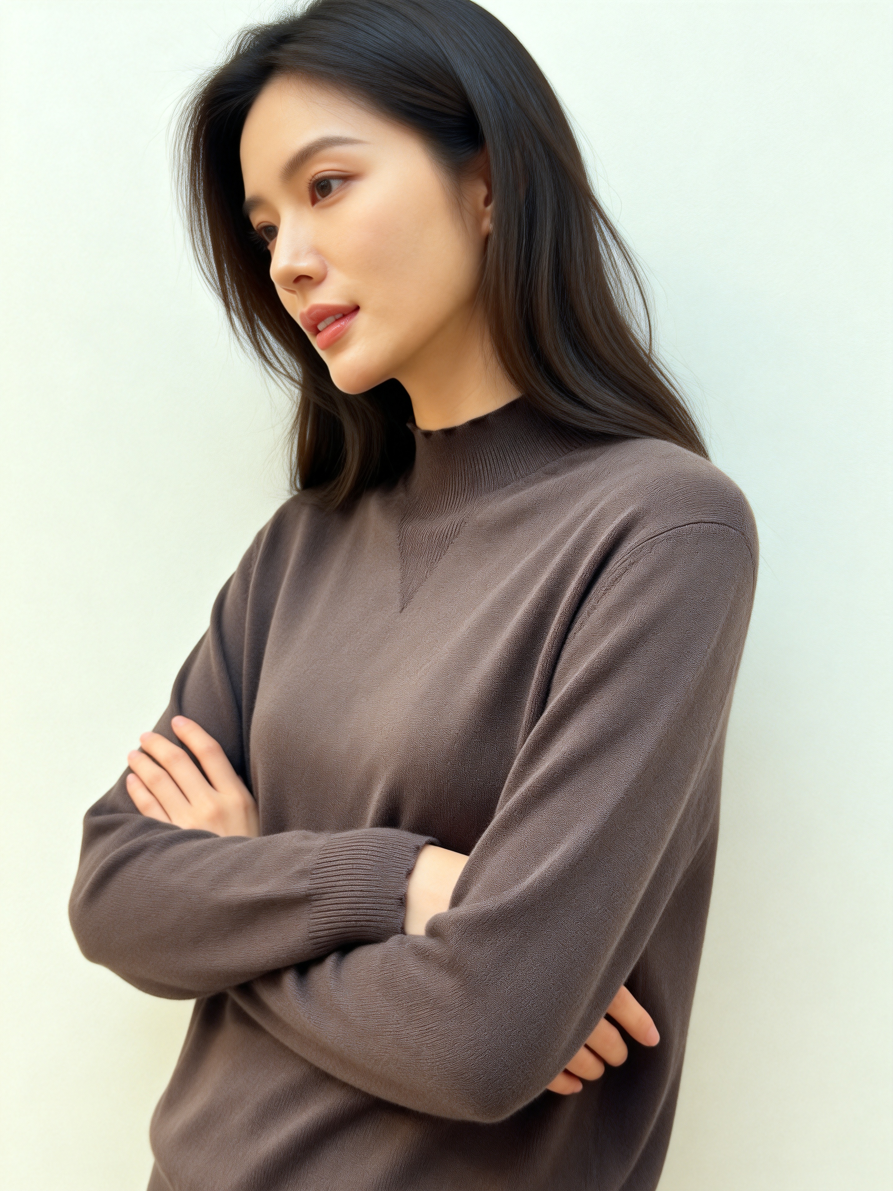 This is a dark brown high-neck sweater with a ribbed collar and cuffs, soft and lightweight. The relaxed fit and minimalist design make it a versatile piece suitable for both casual and semi-formal occasions. The neutral tone allows for easy pairing with various bottoms and accessories. 94% WOOL 6% NYLON