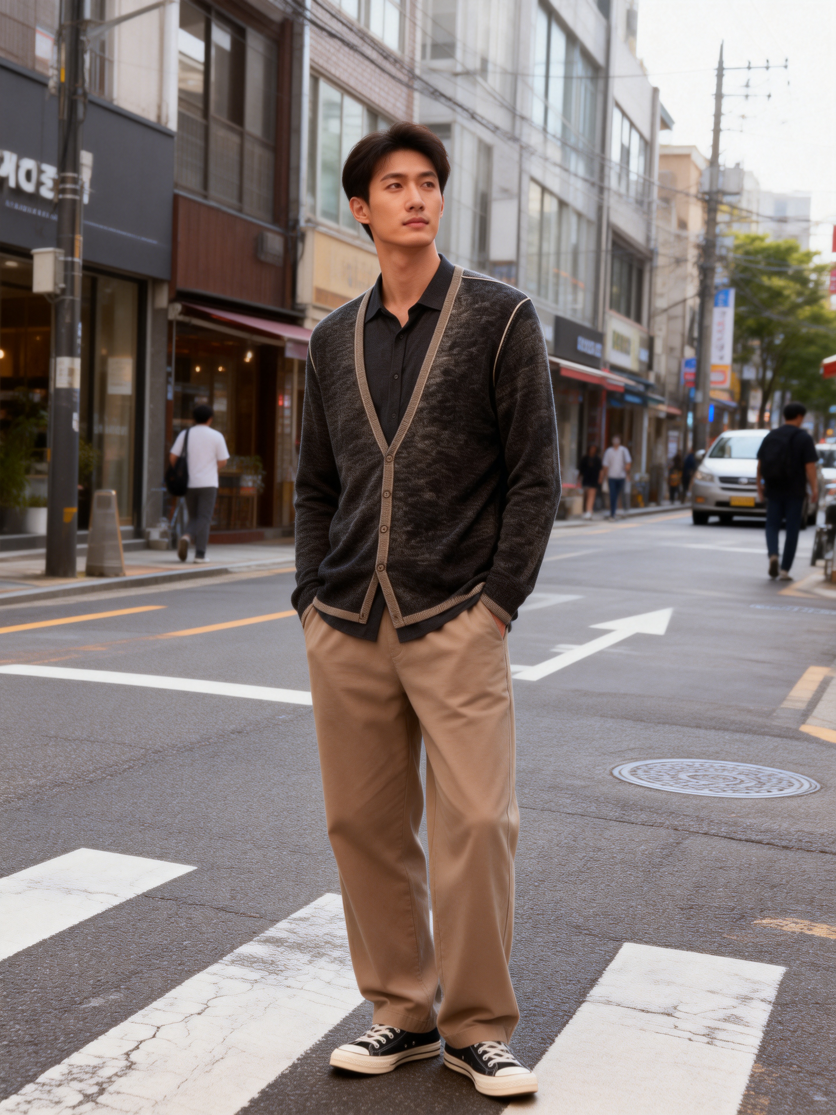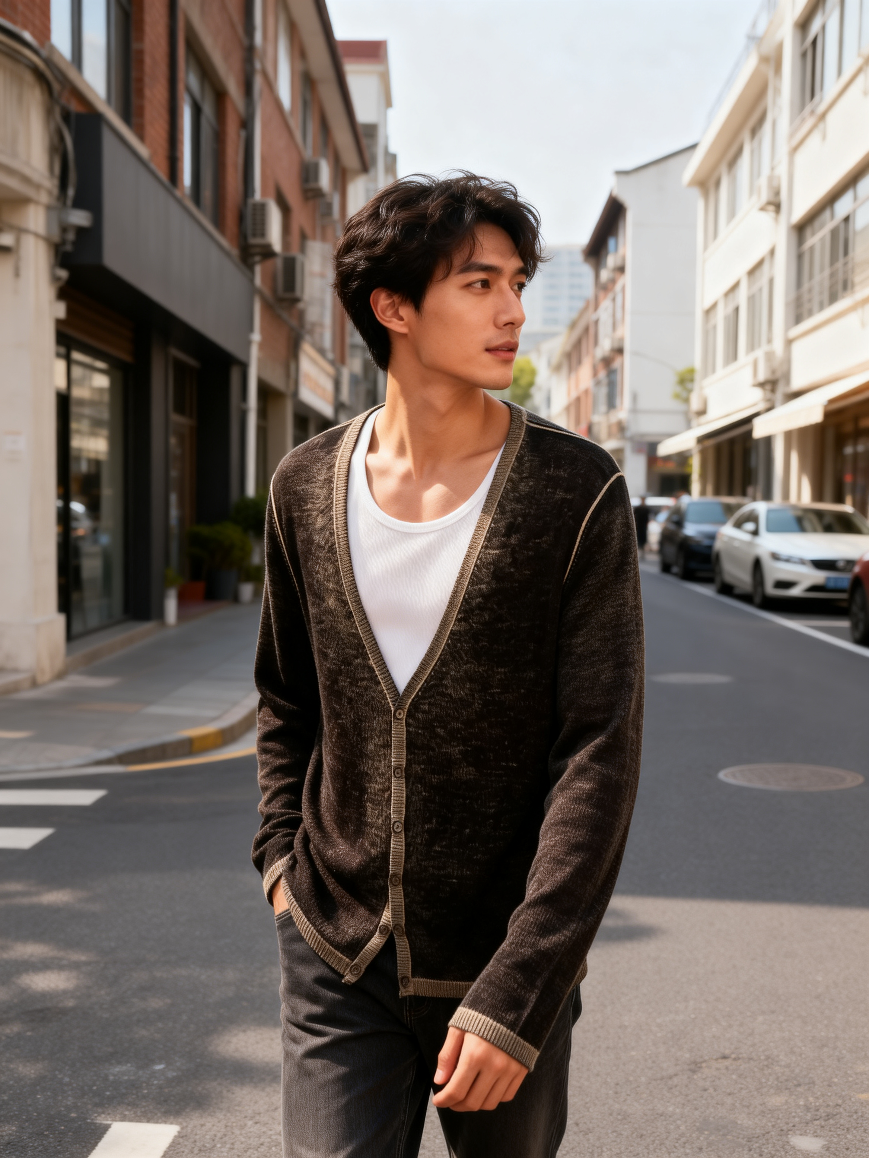 This cardigan features a V-neck design, comfortable feel while maintaining a structured silhouette. Layered over a white tee, it presents a relaxed yet put-together aesthetic perfect for transitional weather. The versatile style easily pairs with jeans for casual outings or can be dressed up with chinos for a smart-casual look. 70% CASHMERE 30% SILK