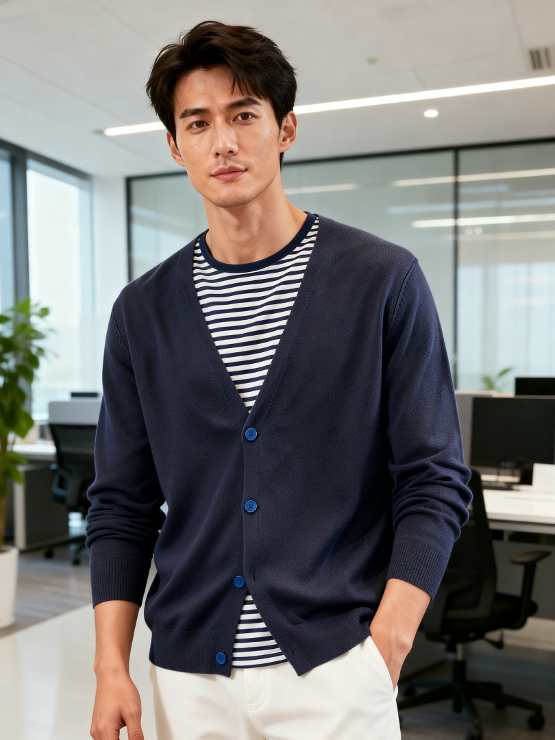 A versatile navy blue V-neck cardigan crafted with premium cashmere, featuring a classic button-front design and long sleeves for year-round wear. The lightweight yet warm material offers exceptional comfort, while the timeless silhouette effortlessly transitions from office settings to casual outings.