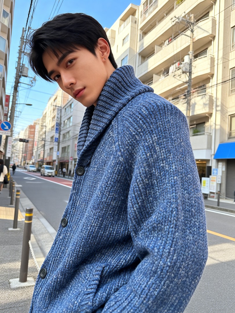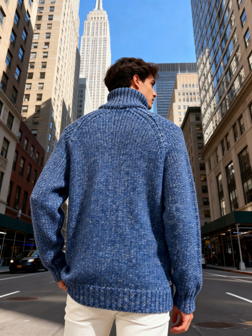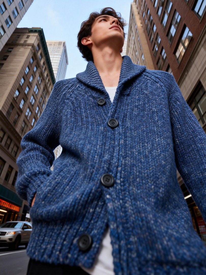 This premium men's shawl-collar cardigan features a rich blue marled knit. It offers exceptional warmth and comfort for transitional weather. The generous shawl collar adds sophistication, while the four-button front closure and practical side pockets combine style with functionality. The slightly relaxed fit ensures versatility—perfect for layering over casual shirts or dressing up with tailored trousers. Elevate your autumn-winter wardrobe with this timeless piece that seamlessly transitions from city streets to weekend getaways.